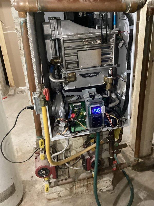 Responded to commercial learning center with no heat complaint. Diagnosed Navien boiler failure due to faulty ignition system. Replaced igniter component and verified proper system operation with successful flame initiation and normal heating function restored.