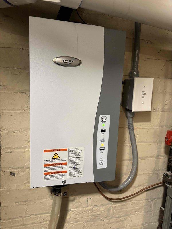 Performed fall maintenance on furnace system and humidifier per prepaid agreement. Inspected humidifier mounted on ductwork and noted normal installation with proper connections. Observed copper water line to humidifier showing oxidation, which is within normal parameters but will require monitoring. All components functioning as designed after service.