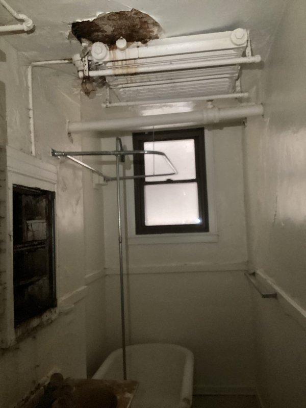 Inspected property for reported radiator leak in bathroom ceiling. Discovered extensive water damage and ceiling deterioration. Determined actual cause was plumbing leak from toilet in unit above, not HVAC system. No boiler service was required.