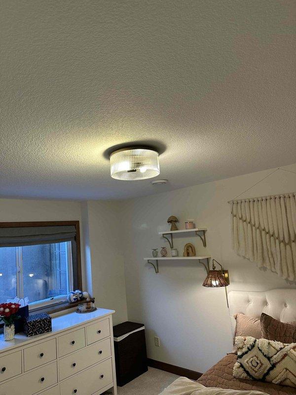 Completed installation of three customer-provided light fixtures in existing locations, including the ceiling-mounted cylindrical fixture with fluted glass in bedroom. Diagnosed electrical issue causing arc fault breaker to trip, replaced problematic outlet and arc fault circuit breaker to resolve the intermittent tripping problem.
