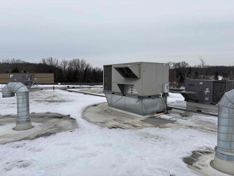 Completed scheduled winter maintenance on three rooftop units, including replacing return air filters (4 units of 18x24x2 and 8 units of 16x16x2). Performed comprehensive heating system safety checks, verified proper heating and fan operation, and inspected heat exchangers. Observed units in good working condition despite snow coverage on rooftop. All systems functioning normally with no issues detected.