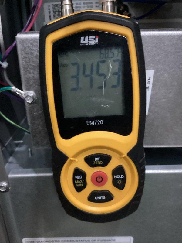 Performed scheduled fall tune-up on furnace and gas-fired plumbing system. Conducted temperature differential testing with UEi EM720 instrument, obtaining reading of 34.5°F, which is within acceptable range. All systems functioning properly with no issues identified.