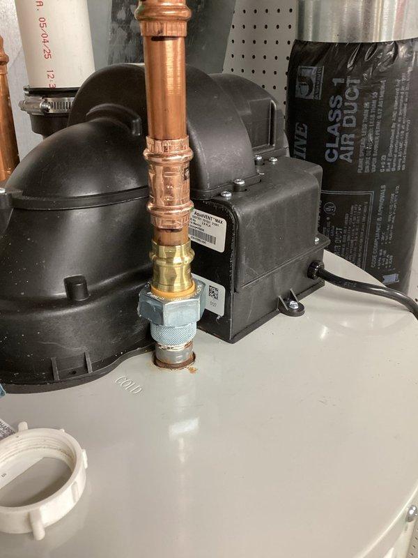 Responded to service call for water heater leak at cold water inlet connection. Diagnosed failed dielectric union on previously installed unit. Replaced defective union and verified proper operation with no leaks.