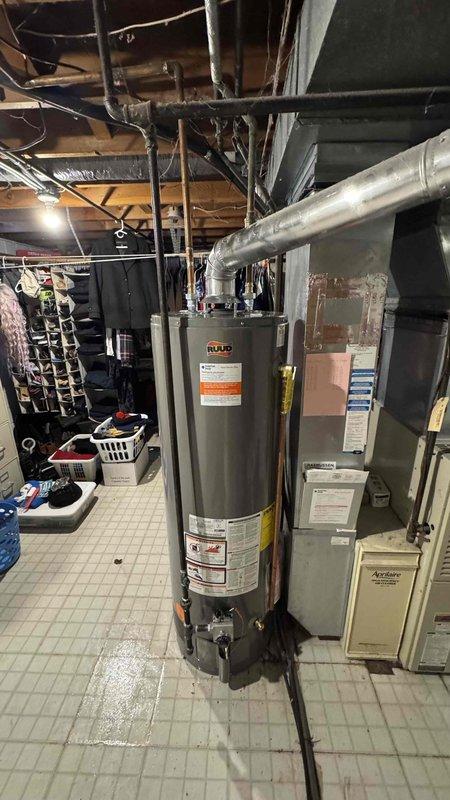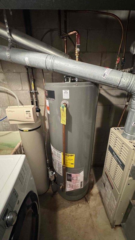 Successfully installed a PROG50-40N RU62 (Tall) 262648 water heater in client's utility room. Connected copper piping with appropriate valves at the top of the unit and ensured proper integration with existing HVAC and water filtration systems. System tested and confirmed operational with no leaks.