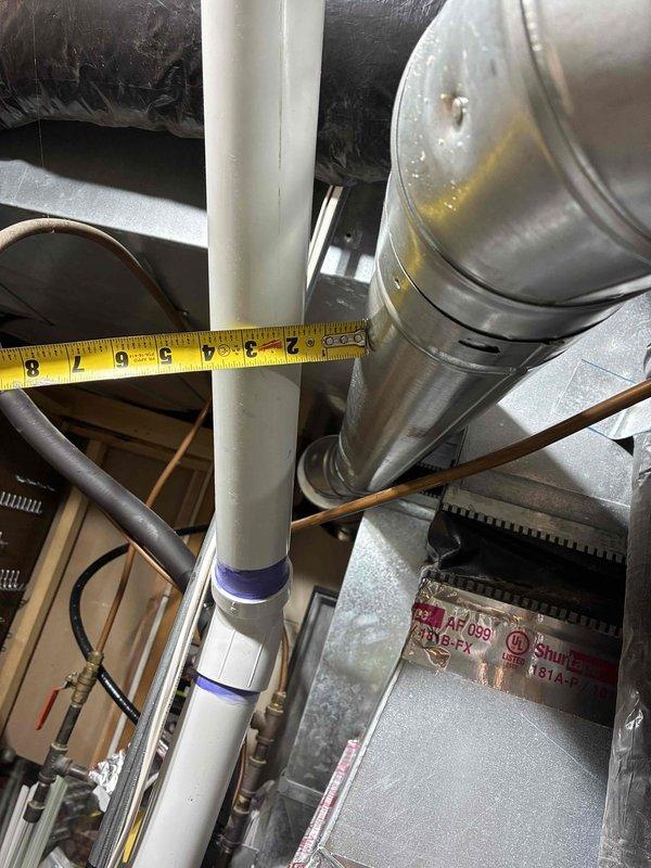 Corrected code violation on water heater vent system by ensuring proper clearance between double wall vent connector and PVC furnace venting. Measured and verified minimum 1" clearance to combustibles as required by code.