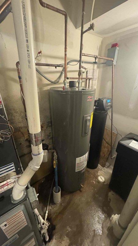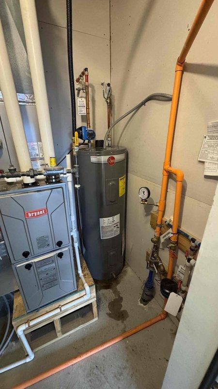 Successfully completed warranty replacement of existing water heater, installing a Rheem 50-gallon electric water heater (warranty valid until 4/1/2026). Re-piped water lines above tank with 18" of hard copper line in/out, connected to existing 240V dedicated electrical line, and tested system for proper operation. All work covered by 1-year workmanship warranty.