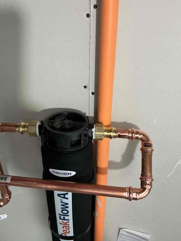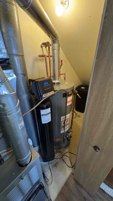 Successfully completed subcontract water softener installation (PROG40S-40N RU62 model) as a like-for-like replacement. Relocated unit as required for proper fit and verified all connections to existing water heater and HVAC system in the utility room.